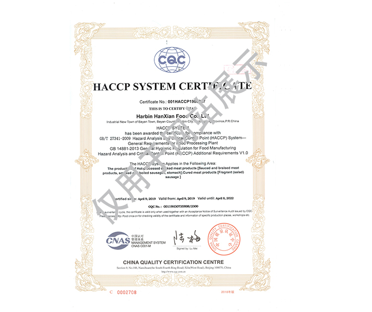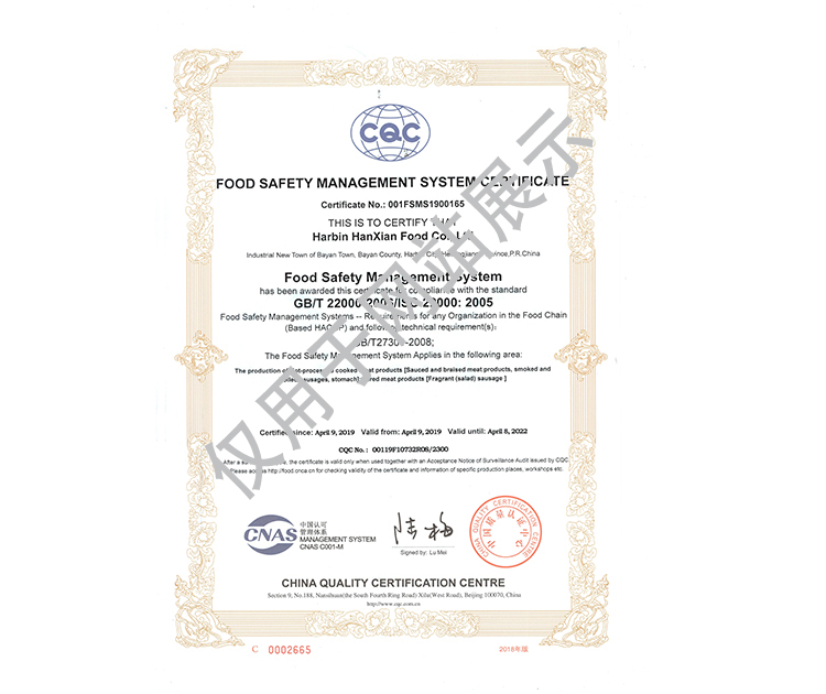 2016年公司通過了中國質量認證中心的質量管理體系(ISO9001)和食品安全管理體系(ISO22000)認證;2017年已取得國家進出口企業認證;是中國肉類協會會員單位,黑龍江省肉類協會副會長單位;2017年,公司產品經中國綠色食品發展中心審核,被認定為綠色食品A級產品;被省畜牧獸醫局確定為全國生豬屠宰標準化創建示范企業(全國僅6家)。2018年12月,被評定為市級農業產業化重點龍頭企業。2019年1月,被評定為省級農業產業化龍頭企業。